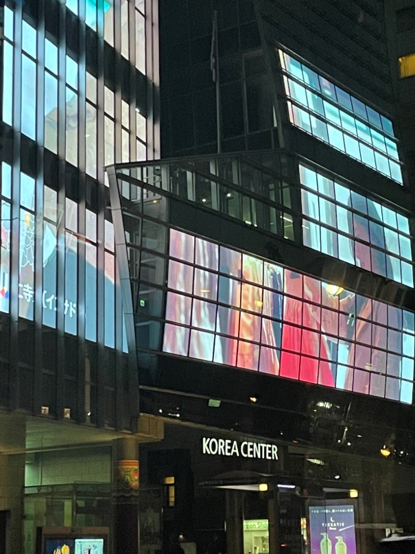 毎日のように、通勤で新宿区四谷にあるKorean Centerの前を通ります。長らくの日韓関係のせいでしょうか、夕方以降も、ビル全体に明かりがついていることはほとんどありませんでした・・・そのような印象が強かったのですが、先週の尹錫悦(ユン・ソンニョル)韓国大統領夫妻の訪日の前後には、夕方、ビルの壁面を彩る映像がありました。