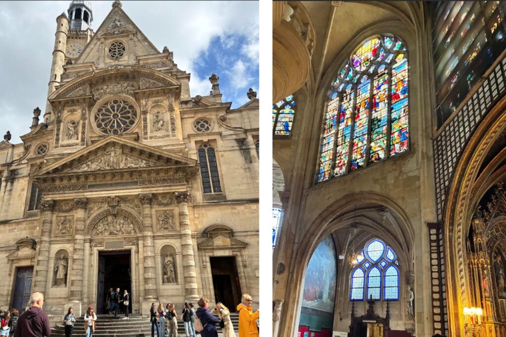 図書館前の壮大な建造物はサンテティエンヌ・デュ・モン教会(1492年から1626年までかかって完成)、無信心な観光客として侵入いたしました。荘厳重厚な雰囲気、神秘的で立派なステンドグラス、緻密な彫刻が施された内陣障壁(と呼ぶ仕切り?)に圧倒されました。後で調べるとパリに唯一残る内陣仕切りだそうです。聖職者と信者を隔てる壁・・・俗界と聖職者を隔てる、ちょっと差別・・・などと俗人は思いました。いずこの教会にも著名人が埋葬されていますが、ここでは偶然気が付いたのは数学者・哲学者パスカルのお墓でした。で、他にどなた・・・とキョロキョロしますとジャン・ラシーヌ(劇作家)とシャルル・ペロー(童話作家)がお眠りでした。観光案内書には1631年に建造されたパリ最古の(パイプ?)オルガンがあり現在も使用されているとありましたが、それは気が付きませんでした。