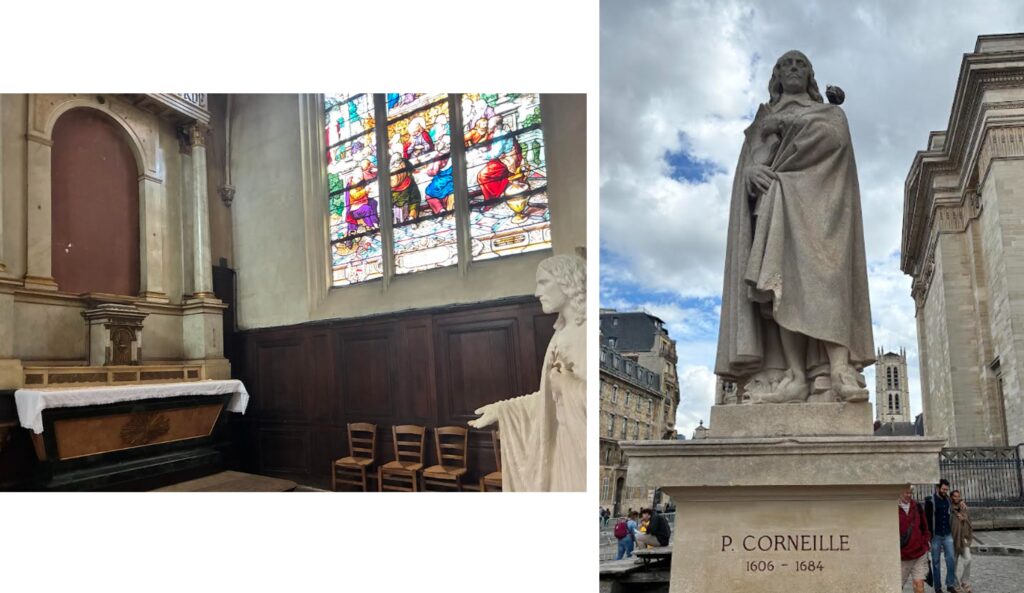 サンテティエンヌ・デュ・モン教会のパスカルのお墓(左)と教会横のコルネイユの像・・・肩に鳩をのせて