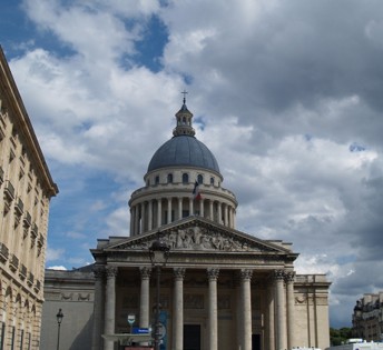 船を降りた後、超人気ではありませんが、やはり名所旧跡ではあるパンテオン(Panthéon)を目指しました。もともとはギリシャの神殿であるパンテオンがなぜパリにあるのかといえば、18世紀後半にルイ15世がパリの守護聖人聖ジュヌヴィエーヴをお祀りするために建造を命じた教会だったそうです。フランスブルボン王朝はルイ王朝とも呼ばれますが、ルイと名乗られる王様が多かったのですね。そのブルボン王朝は1589年から、ナポレオン1世時代やフランス革命を間に挟んで最終的には1830年まで241年続きました。日本の徳川時代は1603年から1868年の265年・・・何だか似ていますね。