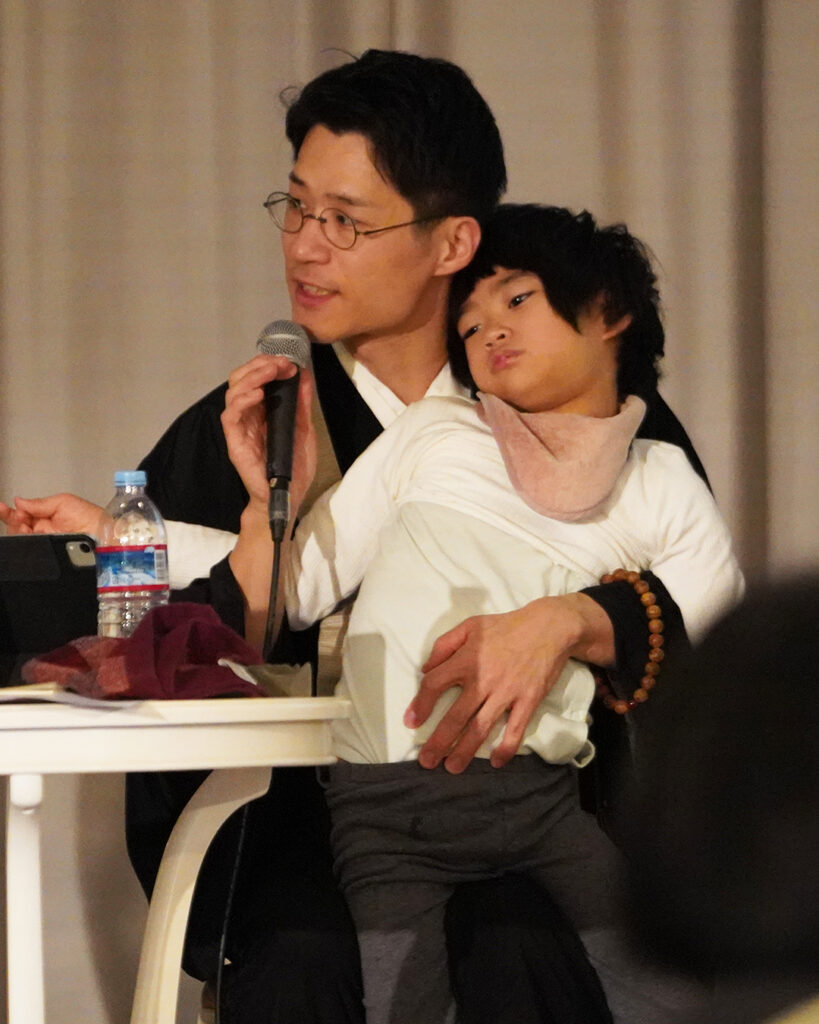 財団関連では「日本財団在宅看護センターネットワーク(以下ネットワーク)」の一員として2016年に、「在宅看護センターLanaケア湘南」を開業した岡本直美さんが最初に発表しました。岡本さんは、共に登壇下さった藤沢市真宗大谷派鵠沼山萬福寺副住職荒木貴弘師のご家族の在宅看護師です。荒木師のご令室は最初の出産時に娘の朝咲ちゃんともども、障害を残してしまわれました。仏の道を歩まれるお父上の貴弘師は、娘の誕生と同時に二人の医療的ケアを要する家族をもつことになりました。めでたいはずの子どもの誕生が、突如、妻と娘の介護と育児の始まりになった・・・岡本さんはそのご一家とともにあります。コロナ感染のために登壇を控えられたお母さまも障害がありますが、お父さまと一緒に壇上に登ってくれた朝咲ちゃんの挙動にすぐに反応しつつの発表でしたが、