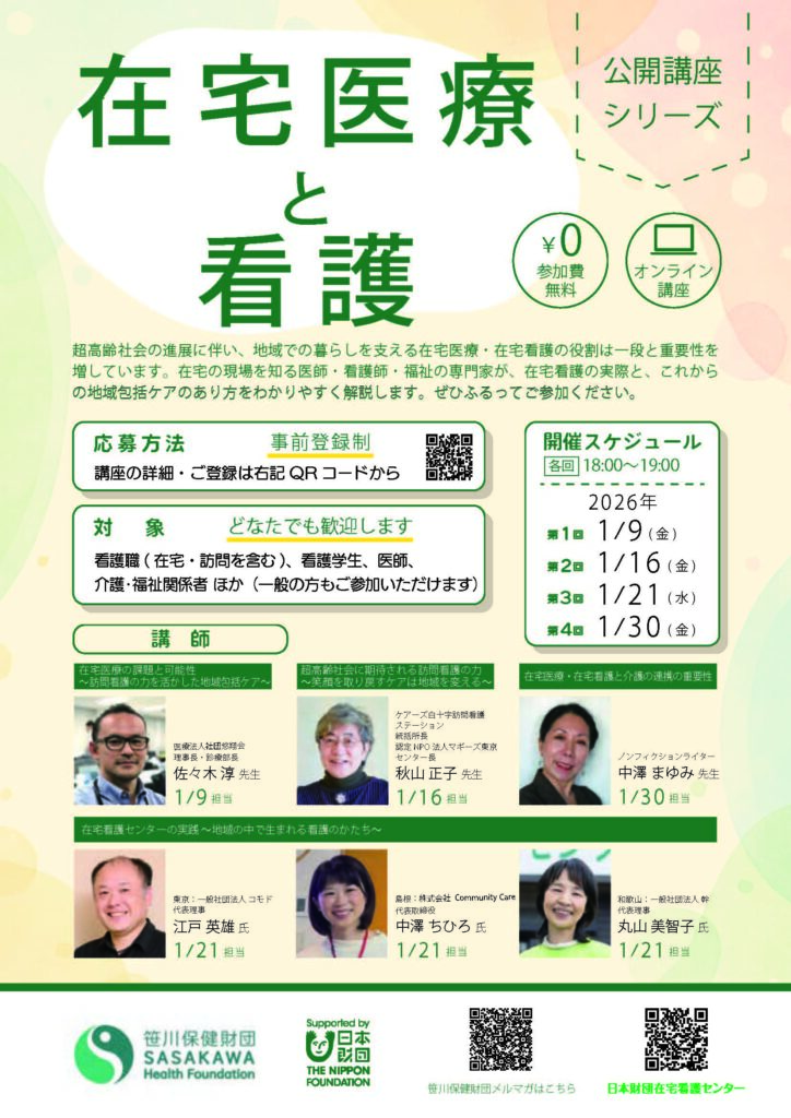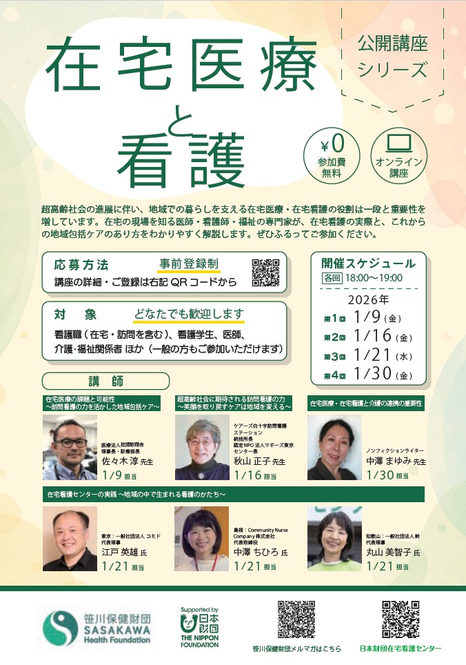 笹川保健財団恒例 ネット公開講座2025年度「在宅医療と看護」 =在宅医療と看護、新しい時代へ 2026年1月9、16、21、30日です。