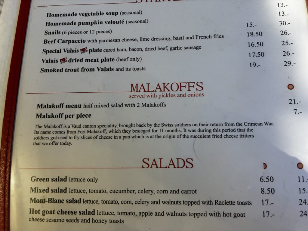 メニューには、スイスのボー州(Vaud canton)の兵士がクリミア戦争時に、11か月間もマラコフ砦(Fort Malakoff)に立てこもったときに、チーズ片をフライパンで揚げて作ったものが原型だとあります。何はおいても、それは挑戦しなくては!と注文しました。写真にありますが、大ぶりのサラダにコロッケのような固まり・・・それがマラコフでした。割ってみると、とろりとしたチーズ・・・う~む、チーズのフライかな?ま、アツアツでおいしい料理でした。