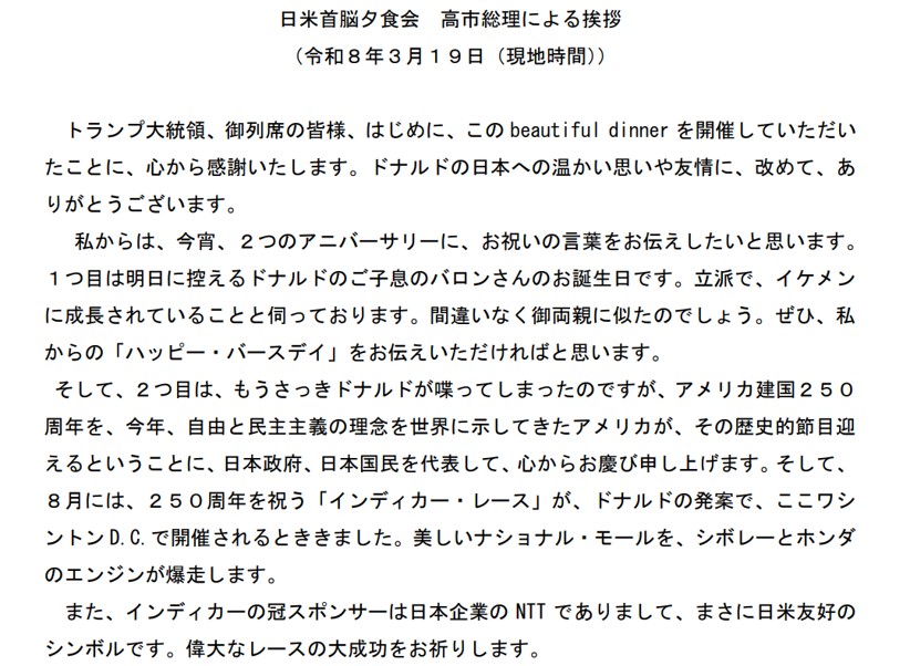 日米首脳夕食会 高市総理による挨拶(令和8年3月19日(現地時間))外務省より