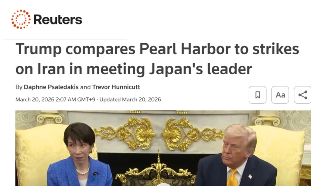 小康状態もありますが、全体としては拡大しそうなイラン攻撃とホルムズ海峡封鎖の最中、国際的な猛者メディアがイッパイの中、常に予測外の発言をなさるトランプ大統領との対談・・・どんなお気持ちかと忖度することすら憚られました。案の定、日本メディアの質問で「なぜ、イラン急襲を同盟国に通報しなかったのか?」に対して出たのが「パールハーバー」でした。
