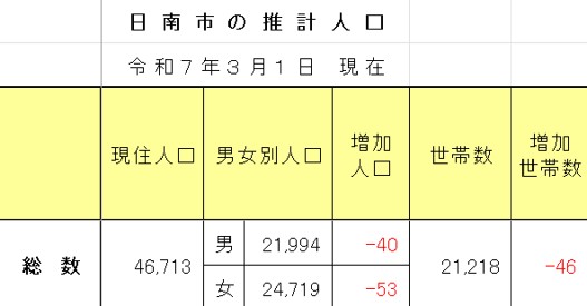 日南市です。宮崎県には、9市6郡(14町3村)があります。県庁所在地の宮崎市でも人口は39万強、第二の都市都城市16万、延岡市が11万、そして第4の都市日南ですが人口は46,713人(2025年3月1日)、そして男女とも人口は減少しています・・・(図1)