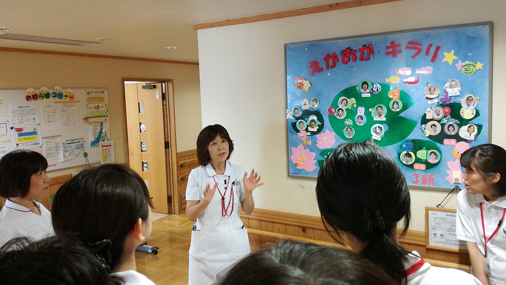 国内における先端的なリハビリテーションの実践を長年にわたってリードされてきた、澤村誠志名誉院長から、リハビリテーションセンターの設立までの経緯、リハビリの理念、および地域包括ケアと地域リハビリテーションの比較等についてご講義いただきました。また篠山次長と岸看護部長に率いられ、病棟、PT/OT等のリハビリ現場、福祉用具や介護ロボット等を見学して回りました。