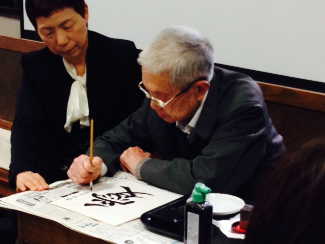 また、病気の後遺症で変形して固い手先に筆を握って書を披露しました。