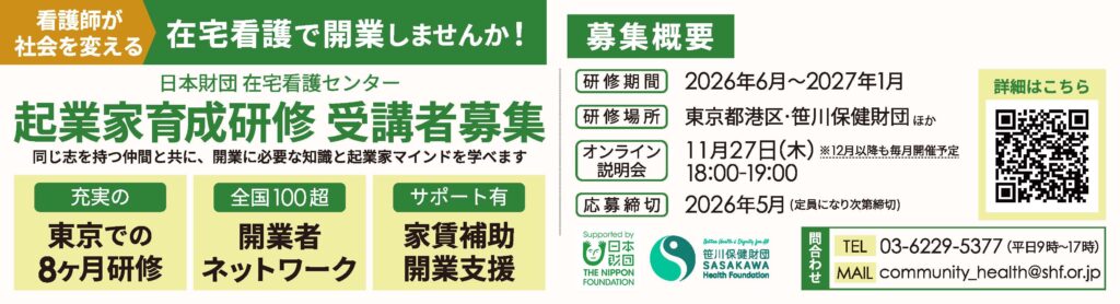 「日本財団在宅看護センター」起業家育成研修 2026年度受講者まもなく募集開始!(11/27説明会開催決定)
