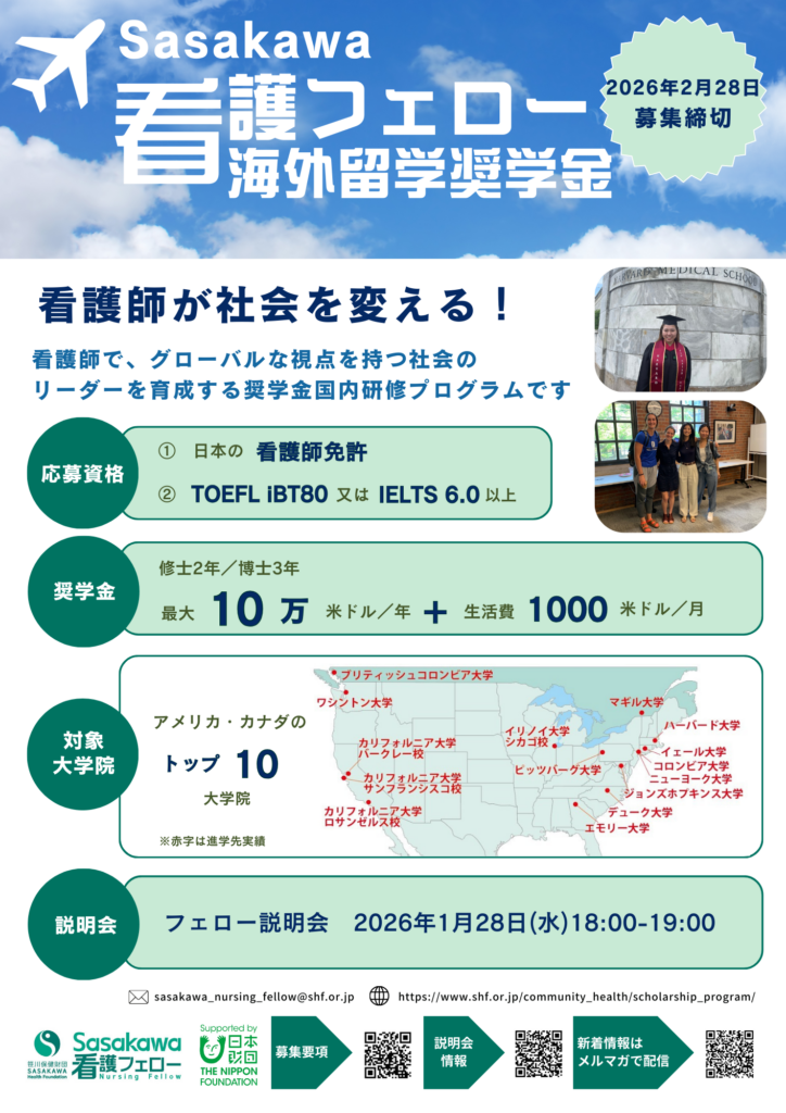 看護師のための海外大学院留学奨学金プログラム「Sasakawa看護フェロー」では、2025年度後期のフェローを募集します!