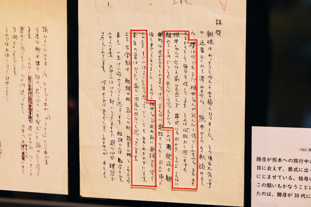 田代:お祖母さんは、恵楓園に何度も訪ねてくれたそうです。勝彦さんは、そんな心の支えでもあったお祖母さんの死に目に会うことができませんでした。ご両親はお祖母さんが亡くなった後に、勝彦さんに知らせました。葬式に参列できなかった悔しさ、怒りがにじみ出ている手紙も展示しています。
