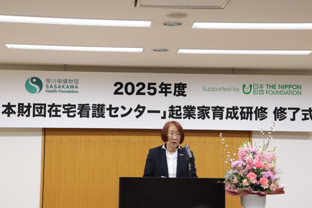各修了者の発表に対し、すでに開業している先輩修了者たちからは、自身の経験に基づく的確な助言や講評が寄せられました。発表会の最後には、喜多会長が総括し、日本財団在宅看護センターネットワークに新たな仲間が加わることへの期待を語りました。
